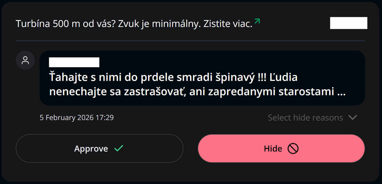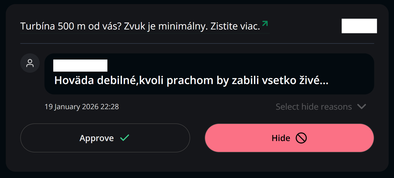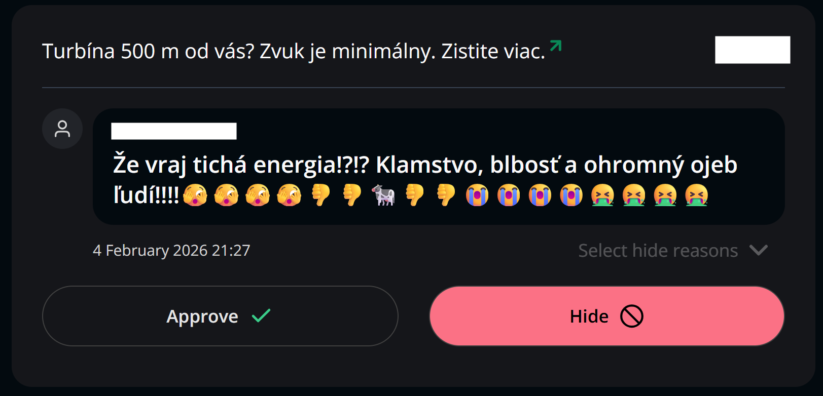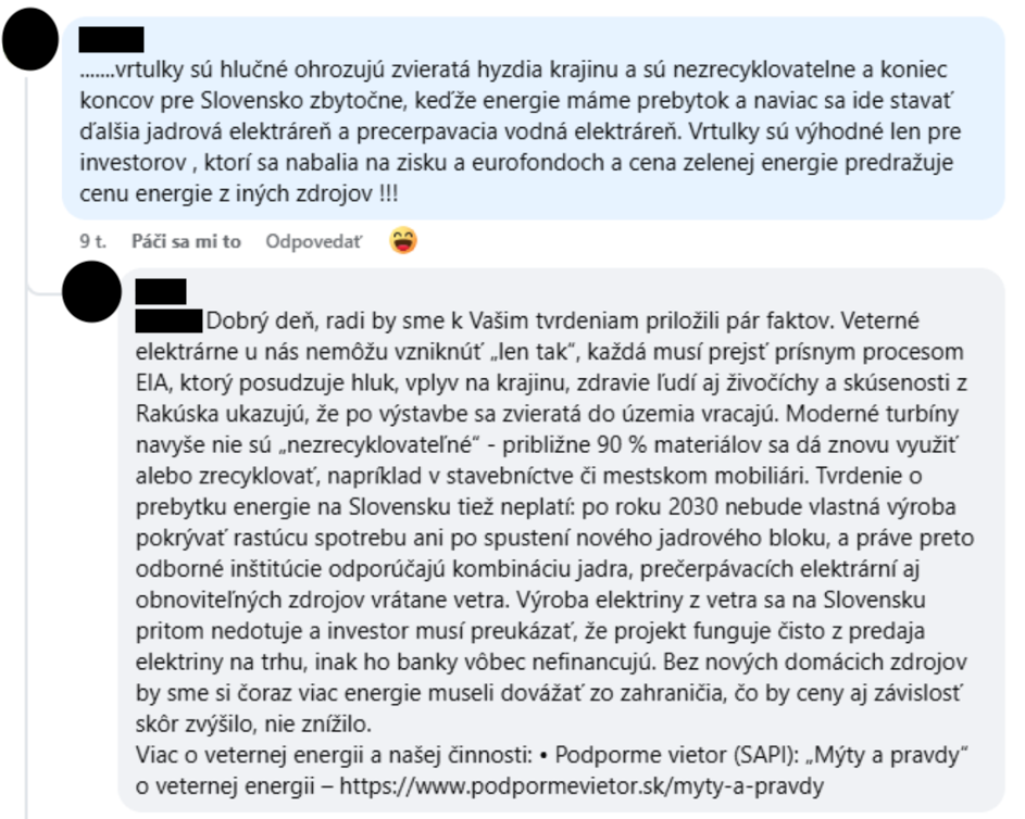 Jedným z príkladov sú aj developeri veterných parkov, tí nás oslovili, aby sme im pomohli vyriešiť situáciu na sociálnych sieťach, ktoré boli doslova zaplavené dezinformáciami a spôsobovali reálny odpor verejnosti. Čas pre náš Krízový Team.